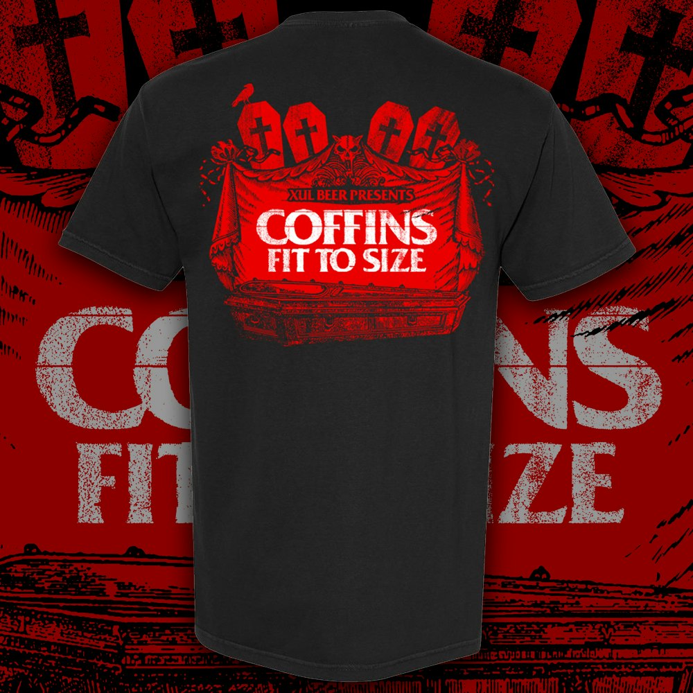 Premium black Comfort Colors tee with the can art from our newest iteration of “Coffins: Fit to Size” collaboration with Adroit Theory on the back and a coffin with the Xul fanghead on the front left breast.