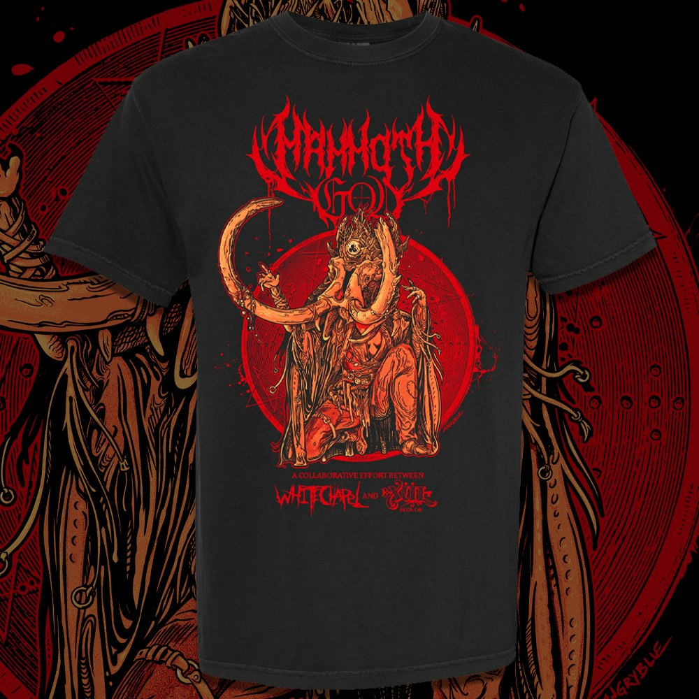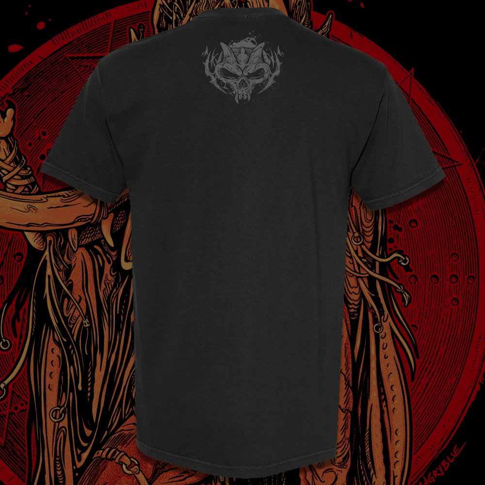 Premium black Comfort Colors tee with the can art from our Mammoth God Light Lager collaboration with White Chapel on the front and the Xul fanghead with a metal twist on the back mid-collar.