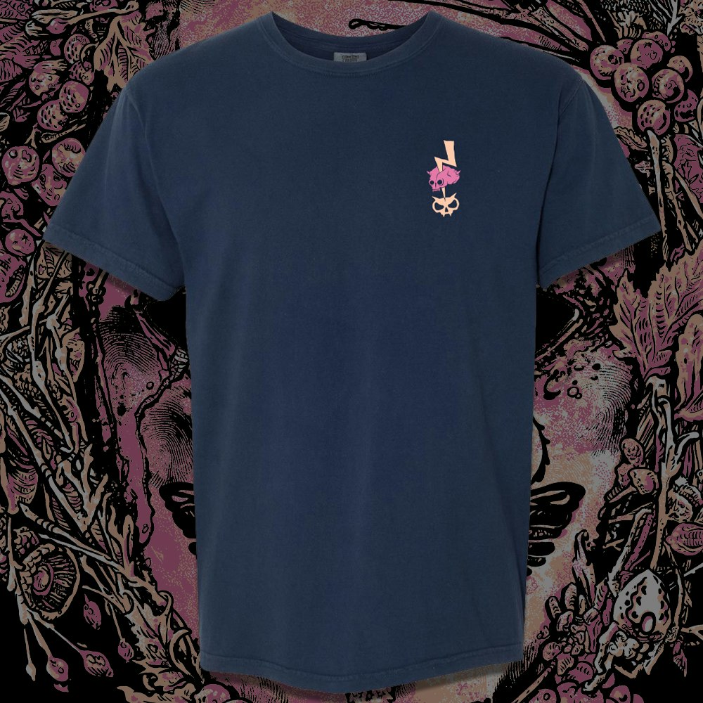 Premium navy Comfort Colors shirt with our “Misery of Consciousness” artwork can art revamped on the back and the Xul fanghead with the Resident Culture logo on the front left breast.