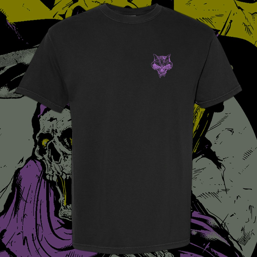 Premium black Comfort Colors heavyweight shirt with our Grim Reaper design on the back and the signature fanghead on the front left breast.