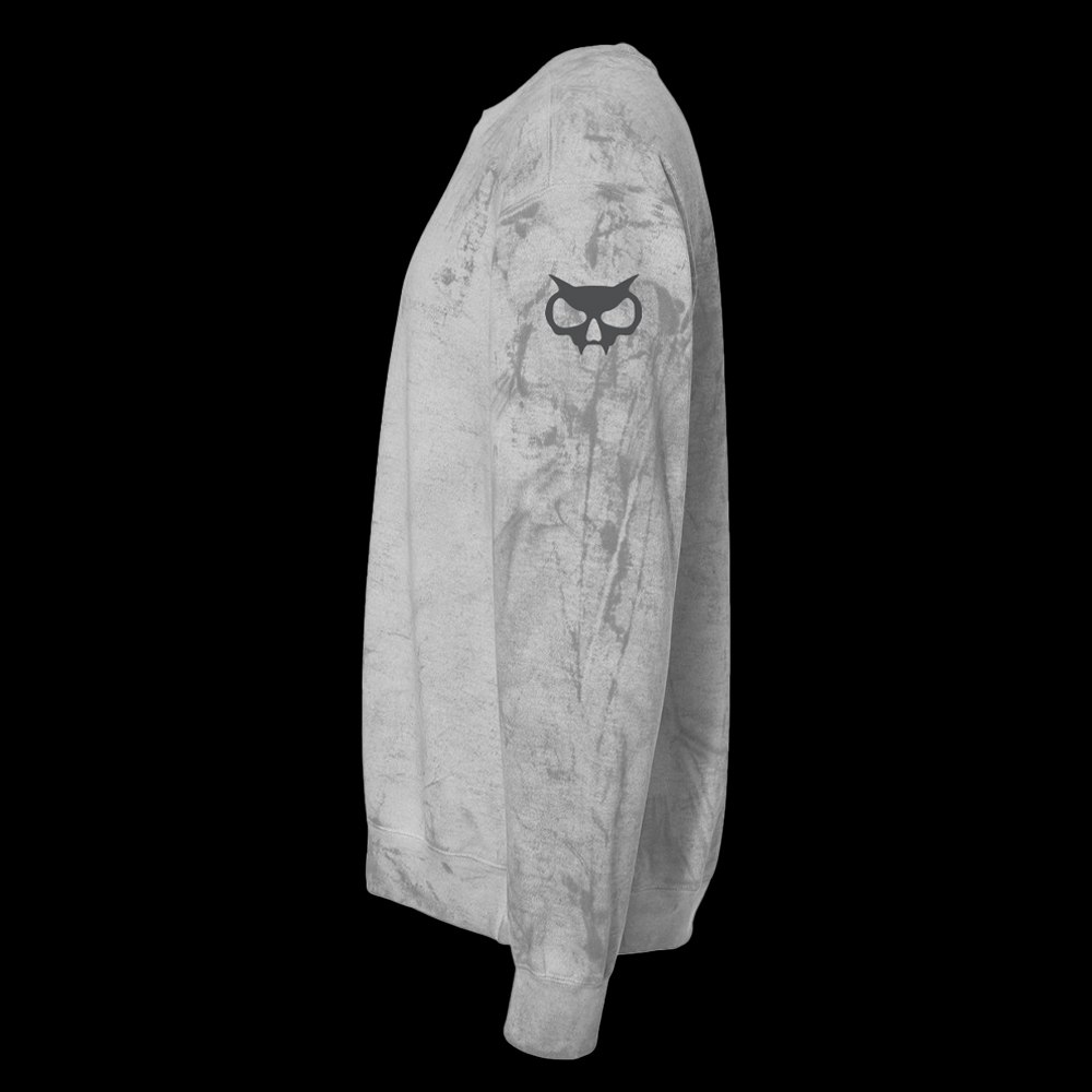 Comfort Colors Colorblast Crewneck Sweatshirt in Smoke with our Classic Xul logo in dark grey across the front and signature fanghead on the left sleeve near the shoulder.