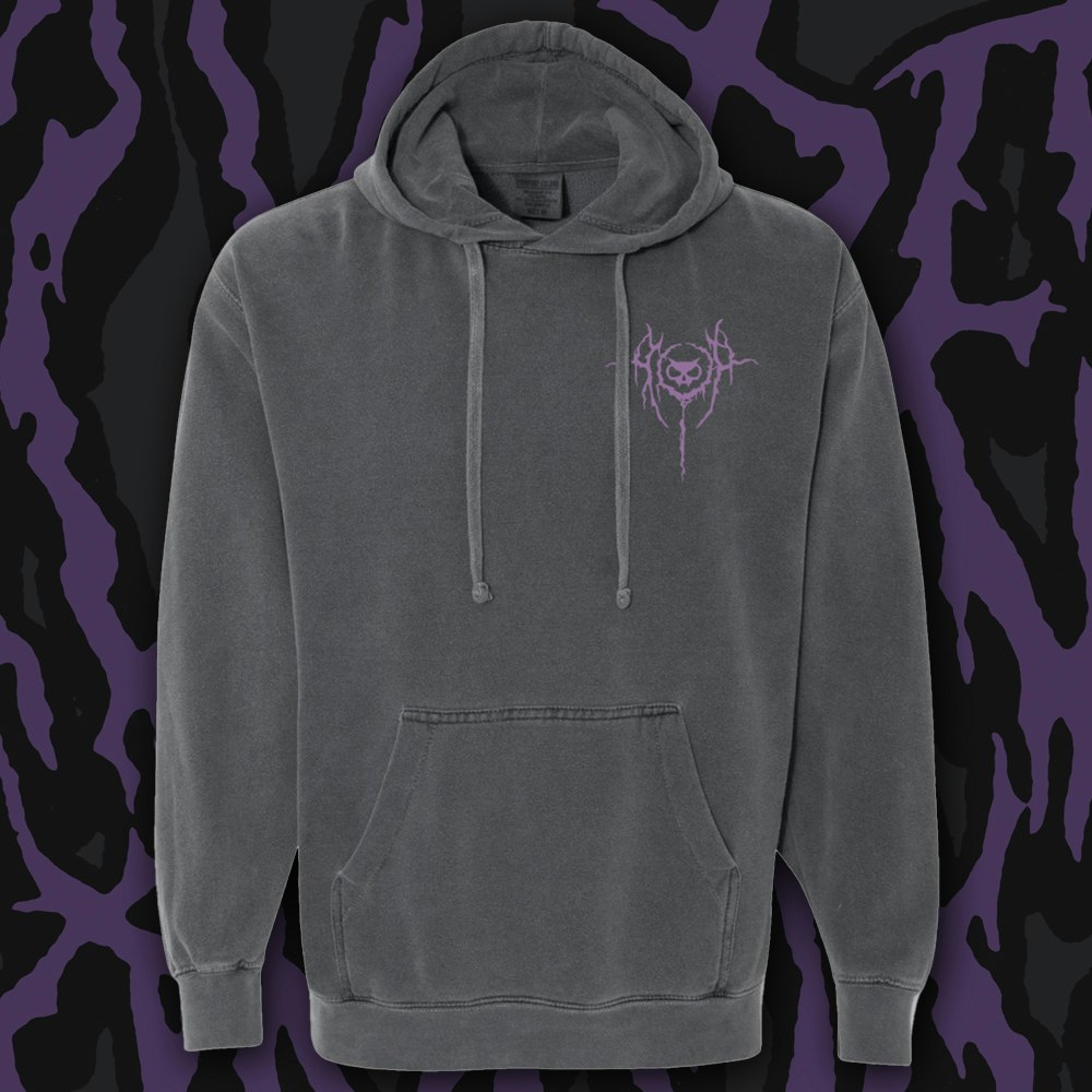 Independent Trading Co. Pigment Dye Pullover Hoodie in black with a vibrant purple “Xul Beer Company” extended across the back in true death metal style and encircles the signature fanghead sitting just beneath in black. The same fanghead design sits on the front left breast in purple. Designed by Angryblue.
