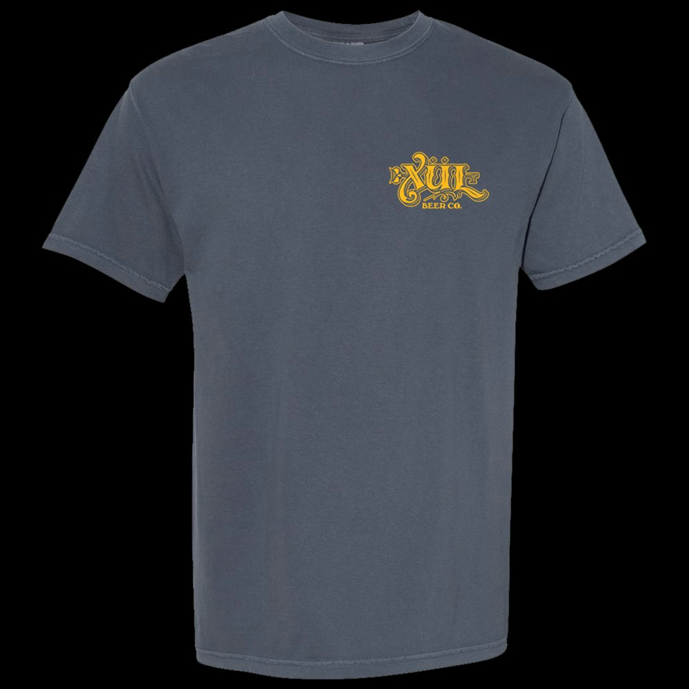 Premium navy Comfort Colors heavyweight shirt with Xul Beer arched over the fang head and Nashville 2026 in yellow on the back. The classic Xul Beer logo sits on the front left breast.